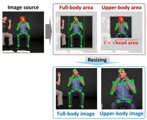 대신에 pose joint에 tight하게 붙여서 bounding box를 찾게 하고, 그를 커버하는 가장 작은 정사각박스를 결정했다.(full-body)